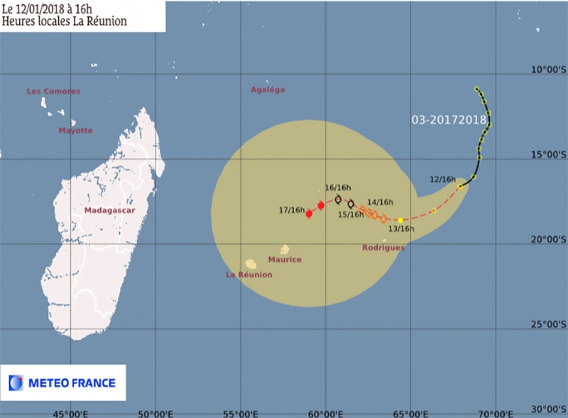 Selon les dernières prévisions du CMRS (Centre météorologique régional spécialisé) Cyclones de La Réunion de Météo-France ce vendredi 12 janvier 2018 à 16 heures, la troisième perturbation tropicale de la saison dans notre zone se situe à 1.365 km de La Réunion. Le système se déplace en direction Ouest-Sud-Ouest à une vitesse de 15 km/h. Il pourrait devenir cyclone tropical aux alentours du 17 janvier. (capture d'écran Météo-France)