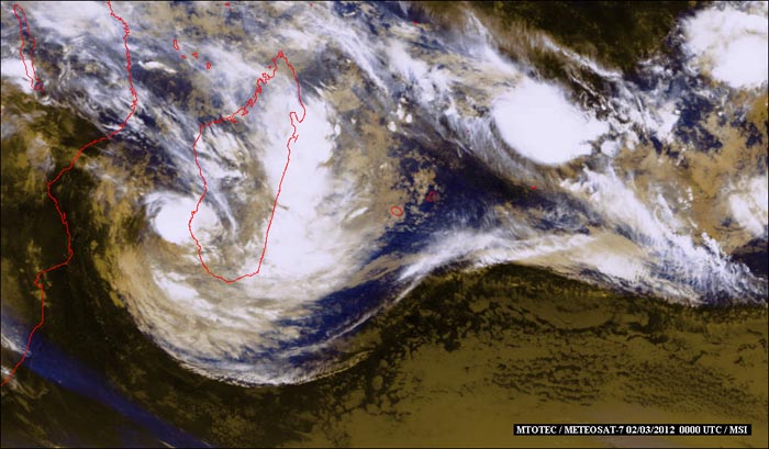 Deux systèmes dépressionnaires sont actuellement présents dans le sud-ouest de l'Océan Indien. A 10 heures ce vendredi 2 mars 2012, la perturbation tropicale - pas encore baptisée - était positionnée par 15.8 Sud et 63.3 Est, soit à 990 km au nord-est de La Réunion. Elle suit une trajectoire sud-ouest à la vitesse de 9 km/h. Quant à la tempête tropicale modérée Irina, elle continue de s'éloigner et se situait par 23.1 Sud et 41.0 Est, soit à 1480 km à l'ouest-sud-ouest de notre île. Irina se déplace vers l'ouest-sud-ouest à 28 km/h. Aucun des deux systèmes ne représente une menace pour La Réunion au cours des prochaines 72 heures.