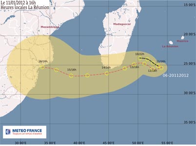 Alors que la vigilance fortes pluies a été levée à 17 heures ce mercredi 11 janvier 2012, une perturbation tropicale se situait à 16 heures à 475 km au sud-sud-ouest des côtes réunionnaises, plus précisément par les points 25.1 Sud et 53.4 Est. Elle se déplace à 19 km/h à l'est-sud-est. Selon Météo France, le système dépressionnaire devrait rester au stade de perturbation tropicale et aucune menace n'est envisagée pour les prochaines 72 heures.