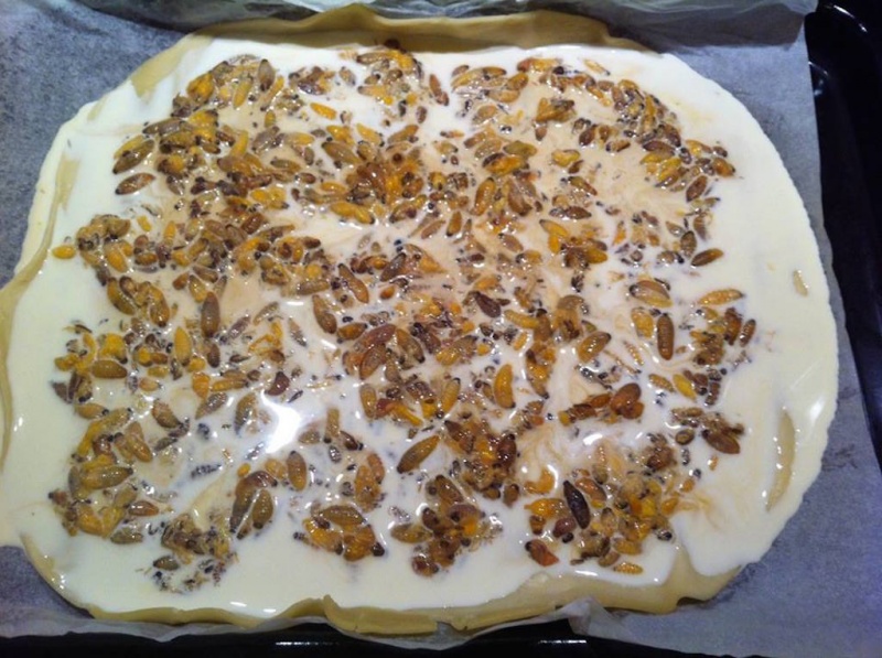 Commencez par étaler la pâte à pizza avant de la garnir de crème fraîche. Rajoutez les larves de guêpes. Elles peuvent auparavant être légèrement frites à la poêle avec un peu de sel. S'il s'agit de larves congelées, n'oubliez pas de les laisser à décongeler pendant une dizaine de minutes. Parsemez ensuite le fromage et les olives. On met ensuite en four pendant 15 à 20 minutes avec une température à 200 degrés. Laissez refroidir et dégustez.