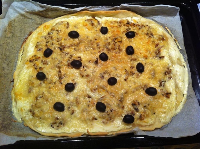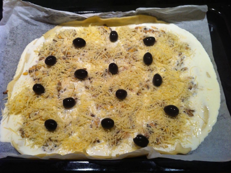 Pour les ingrédients, il vous suffit d'une pâte à pizza - de préférence faite maison -, 200 grammes de larves de guêpes fraîches ou congelées, une petit brique de crème fraîche liquide, un sachet d'emmental râpé ainsi que des olives noires.