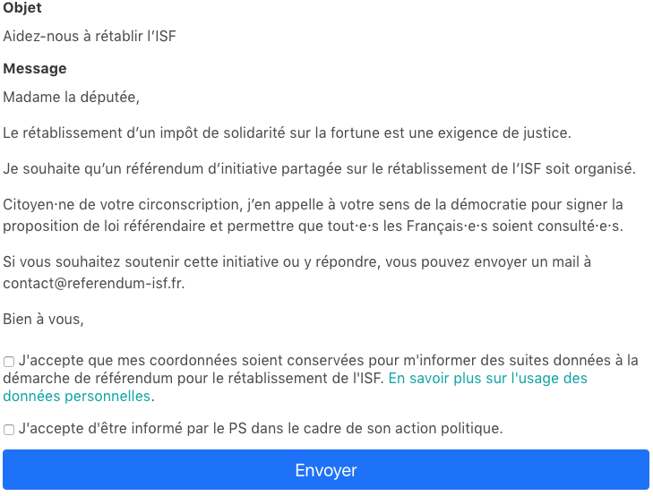 Sur le site, vous trouvez des explications sur le fonctionnement du RIP, sur l'ISF et la listes de tous les parlementaires français. Vous cliquez sur votre département, sélectionnez votre député.e ou votre sénateur.rice et un mail prérempli apparaît.