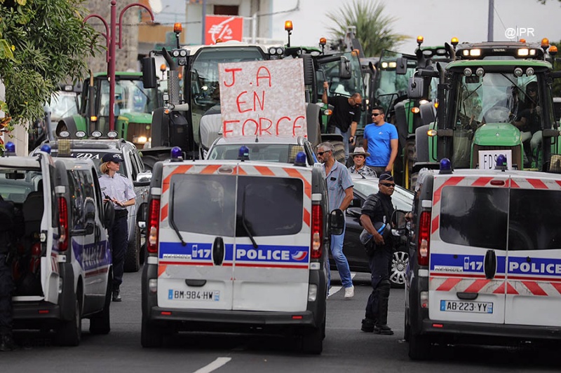 • 14h10 - Le convoi de la CGPER est arrivé à la daaf. Ils a été stoppé par le cordon de policiers sur le boulevard de la Providence. Des fourgons de police font face aux planteurs. Les tracteurs des Jeunes Agriculteurs ont aussi été bloqués par les forces de l'ordre de l'autre côté du boulevard de la Providence