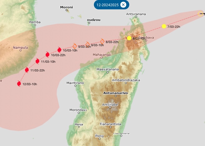 "Après avoir traversé Madagascar [la zone perturbée] devrait ressortir dans le canal du Mozambique samedi et continuer sa route vers l'ouest en passant au large sud de Mayotte et de l'archipel des Comores. Puis elle devrait bifurquer vers le sud-ouest lundi et passer non loin des côtes du Mozambique mardi", détaille Météo France.