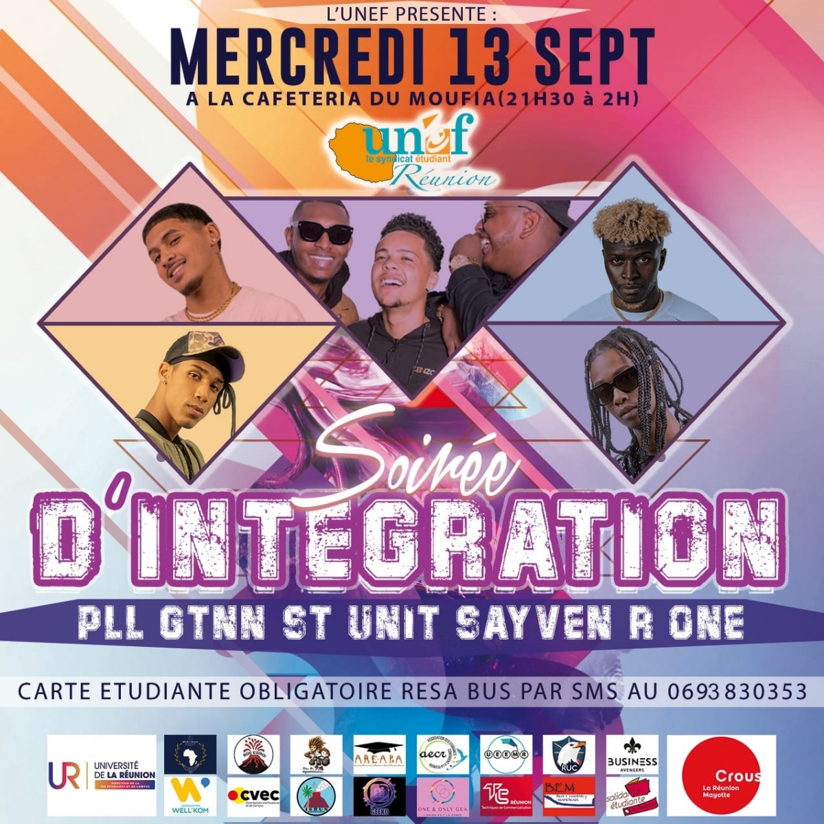 Ce mercredi soir 13 septembre 2023 la soirée d’intégration à l'Université du Moufia sur le parvis de la cafétéria. Plusieurs artistes viendront animer cette première soirée de l’année universitaire 2023/2024. Tous les étudiants de l'île sont conviés. La soirée commencera à 21h30 et se terminera à 2h. L'événement est organisé par l’Unef (Union nationale de étudiants de France). Des navettes gratuites de bus ont été mises pour transporter les étudiants en provenance du Sud (Photo D.R./ Université de La Réunion)