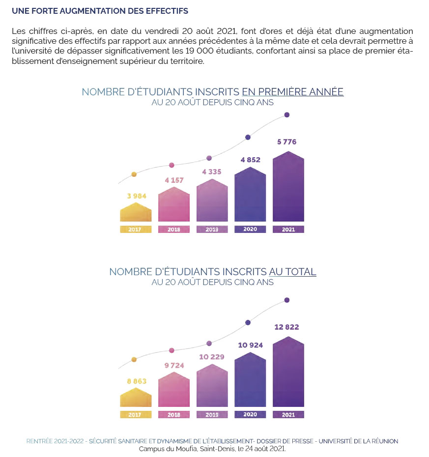 L'université de la Réunion a dévoilé ce mardi 24 août 2021 le plan sécurité sanitaire et dynamisme de l'établissement pour la rentrée 2021-2022. Il s'agit de la deuxième rentrée marquée par la crise sanitaire, qui conduit l'université à répondre à de multiples défis dont la réussite des étudiants ainsi que la sécurité de l'ensemble de la communauté, étudiants comme enseignants. A ce jour l'université compte déjà plus de 19.000 étudiants inscrits. Le corps académique annonce pour cette année plus de dix nouvelles formations. Le développement du numérique reste également dans les priorités de la faculté, au vu du contexte sanitaire.(Photos Université)