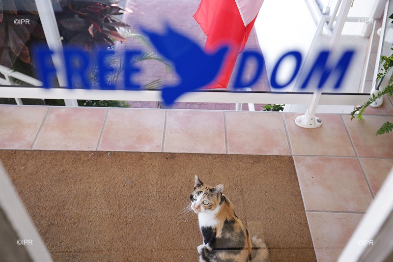 9h05 : Trônant sur une volée de marches et sous un drapeau français installé depuis l'Euro, Titoune la chatte écaille de tortue accueille les visiteurs. Le félin câlin est la mascotte de la radio à la colombe. Agacée de ne pas avoir été prévenue de l'arrivée des journalises d'Imaz Press, elle s'éloigne dignement. La boule de poils a même un compte facebook, Titoune chatte radio 974 et elle a plusieurs dizaines de followers.