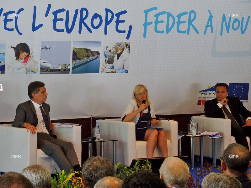 "I'm verrrry glad to be here today and see this very important major project" ... "Je suis vraiment contente que mon mari travaille dans une direction de société qui a obtenu le marché du ciment dont on voit le béton couler de la grue en face là, derrière moi, vraiment merci aux Réunionnais qui vont payer 40 ans hors fonds européens cette route qui va consommer beaucoup de béton et qui fait travailler des roumains et pas n'importe lesquels... merci