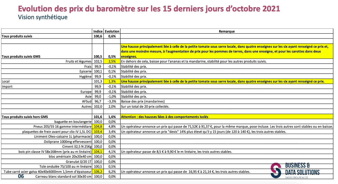 Les principaux enseignements de la première livraison effectuée par le bureau d’études SAGIS de ce baromètre des prix du 29 octobre 2021 sont les suivants :