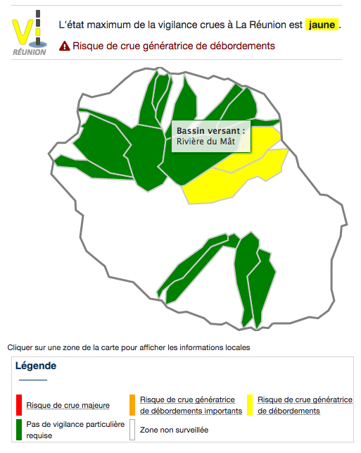 De fortes précipitations sont survenues en seconde partie de nuit ce lundi 23 décembre 2019. Ces fortes pluies ont entraîné une élévation des niveaux d'eau sur le secteur est, notamment sur les bassins versants de la rivière des Roches et de la rivière des Marsouins. Les deux cours d'eau sont donc en vigilance jaune ce qui signifie qu'il y a un risque de crue génératrice de débordements.