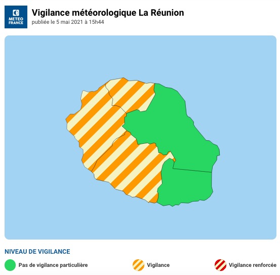 "Une zone pluvio-orageuse abordent l'ouest de notre île en soirée" annonce Météo France ce mercredi 5 mai 2021. Elle se manifestera par des pluies localement abondantes, parfois orageuses sur les régions ouest, sud et nord au fil de la nuit. Ces régions sont donc placées en vigilance fortes pluies et orages à partir de 19 heures. Les précipitations devraient s'atténuer en seconde partie de nuit.