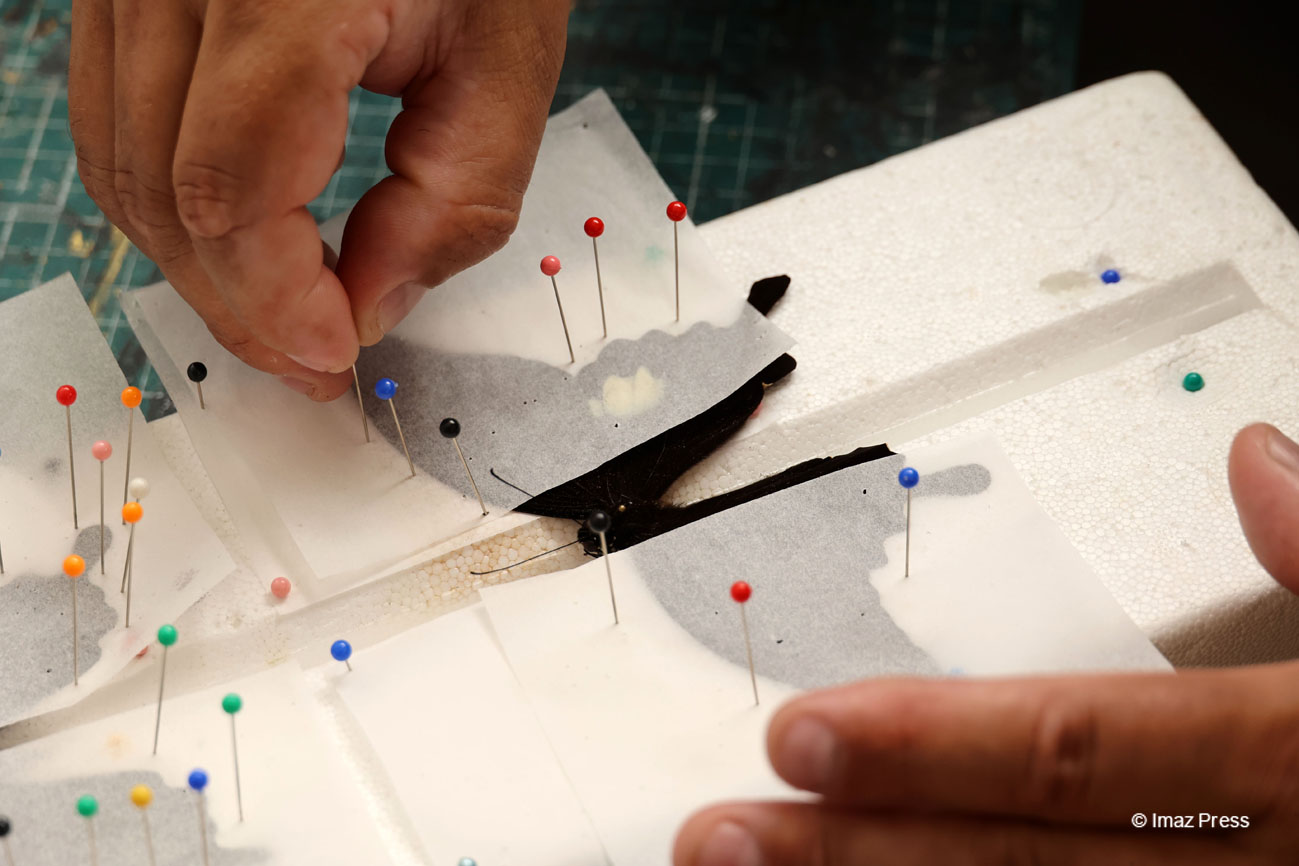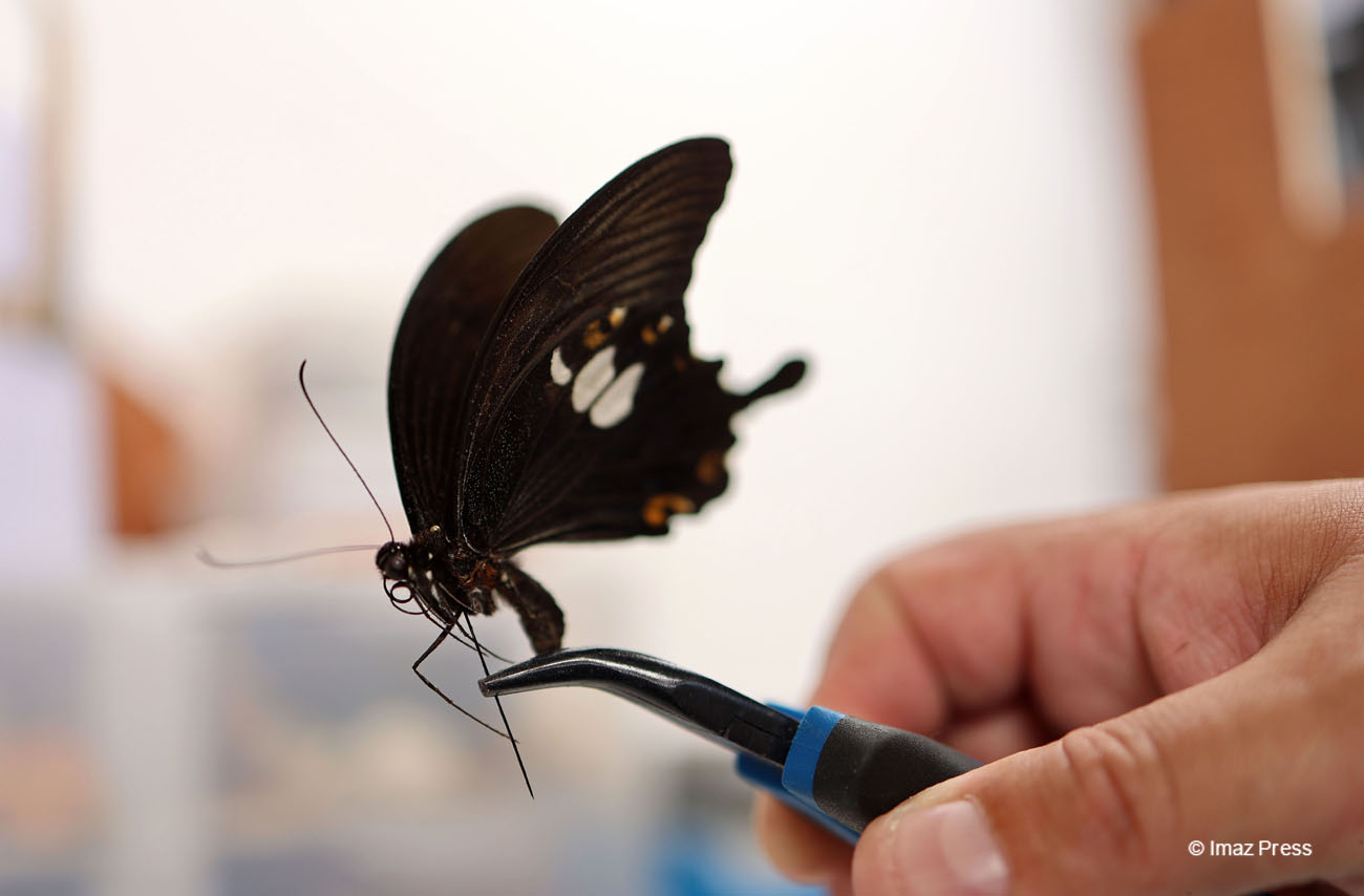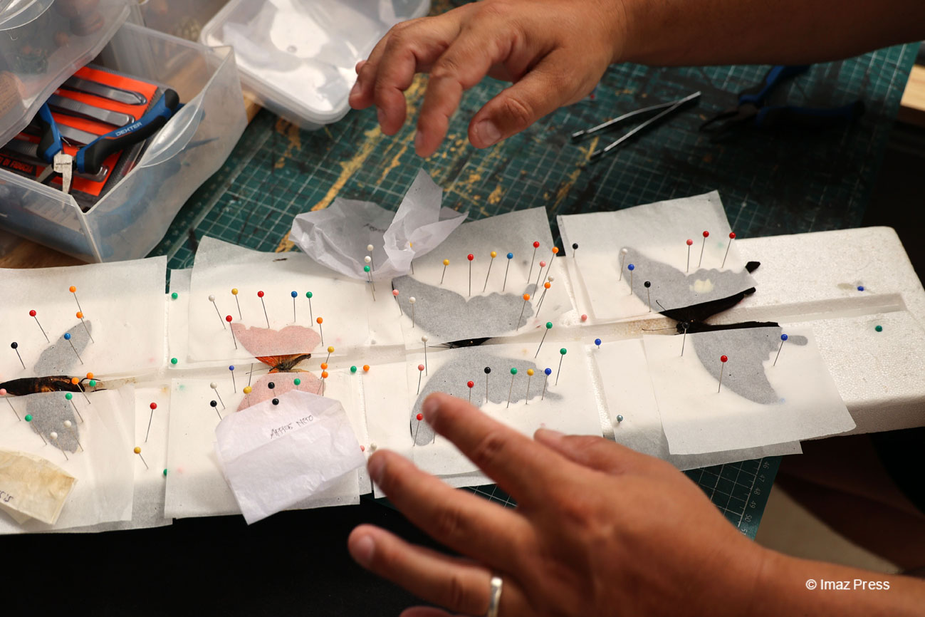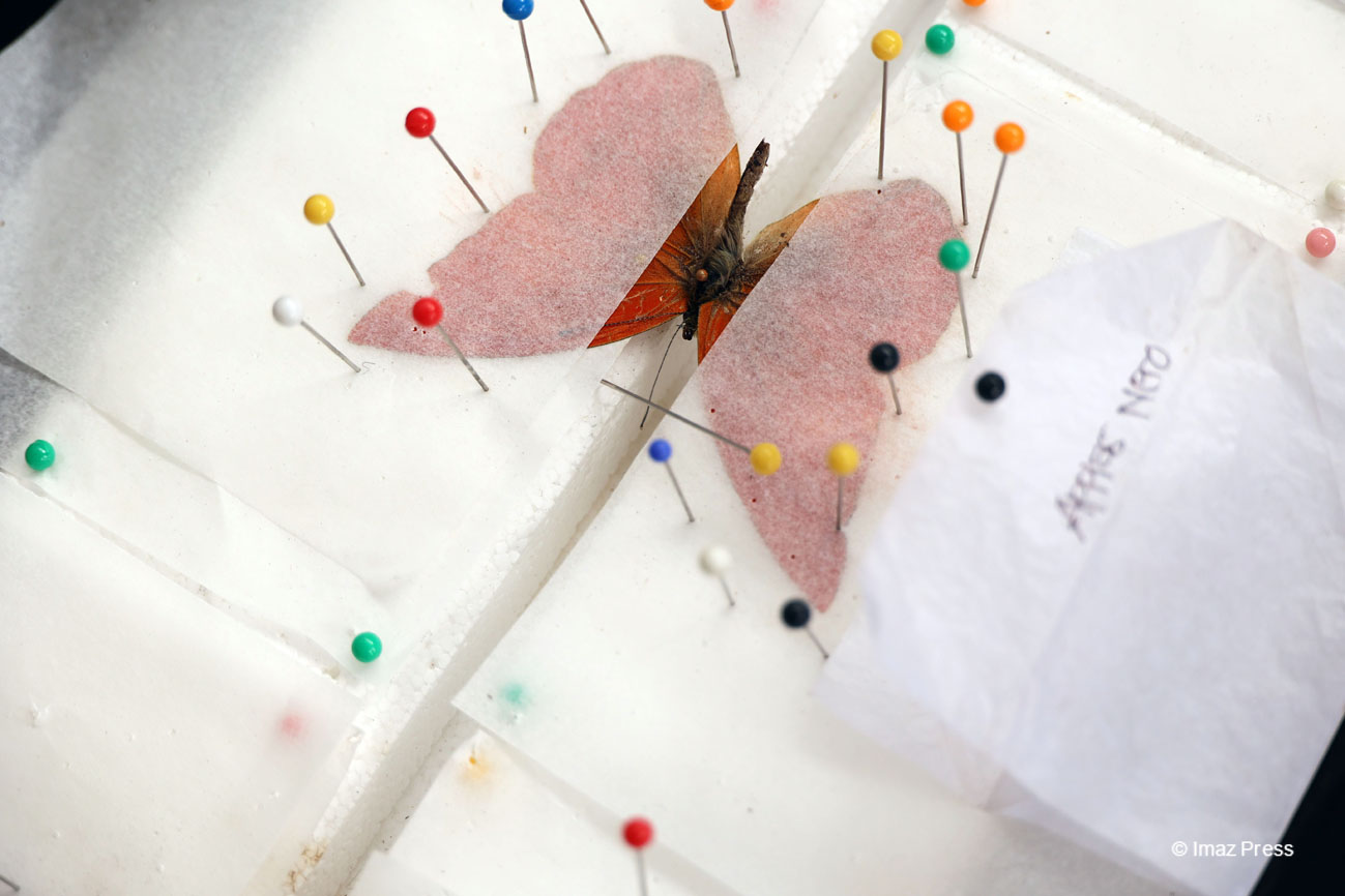 Vient ensuite la partie technique. Arrivés dans des boîtes en plastique, bien protégés, les insectes sont ensuite traités, désinfectés et réhumidifiés. Une étape obligatoire pour ouvrir le papillon. « Une fois ouvert, on le laisse entre quatre à sept jours pour le séchage et ensuite on va l’enfermer dans une boîte d’entomologie », indique Ludovic.