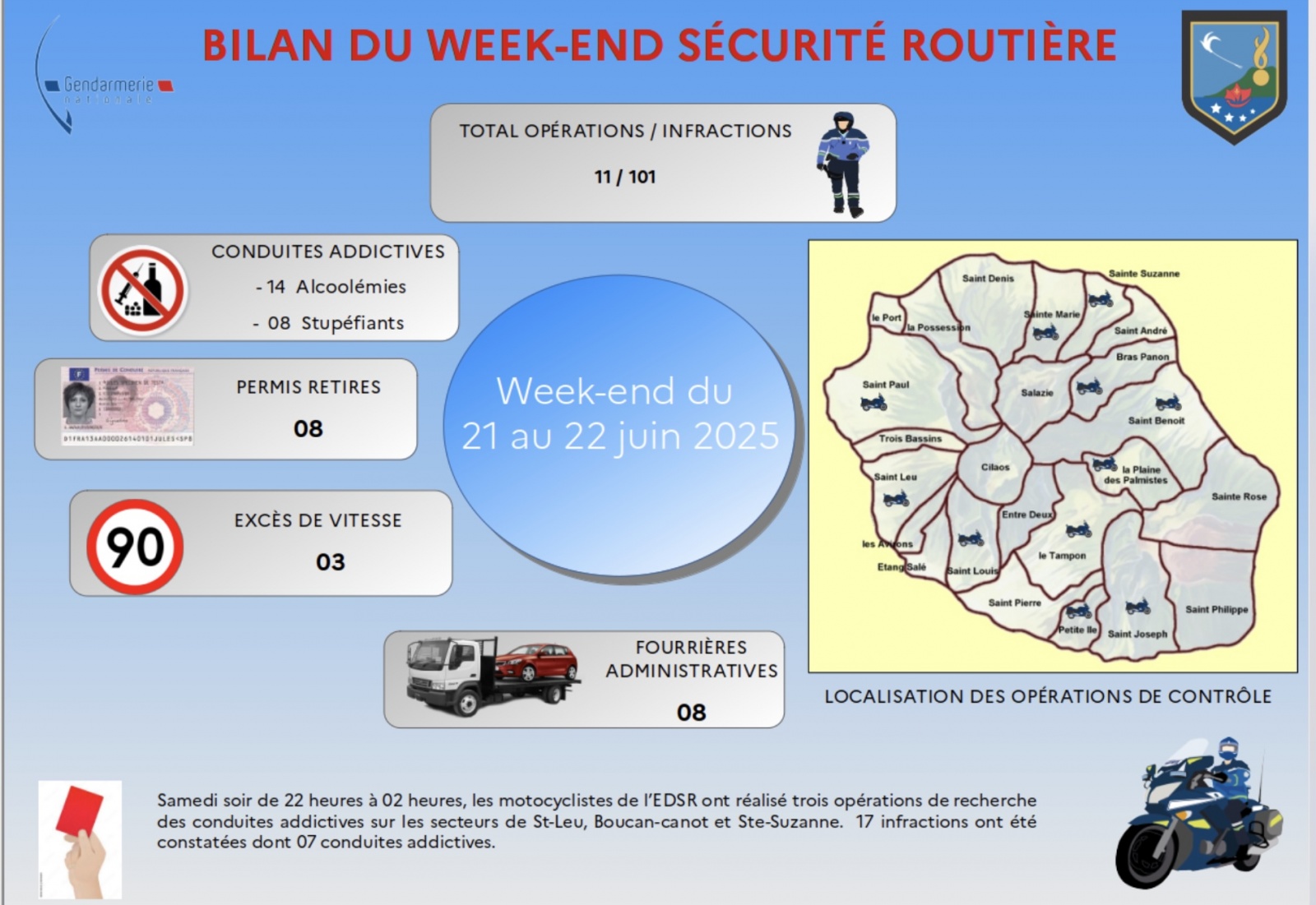 Samedi soir de 22 heures à 2 heures, les motocyclistes de l'EDSR ont réalisé trois opérations de recherche des conduites addictives sur les secteurs de Saint-Leu, Boucan-canot et Sainte-Suzanne. 17 infractions ont été constatées dont 07 conduites addictives.