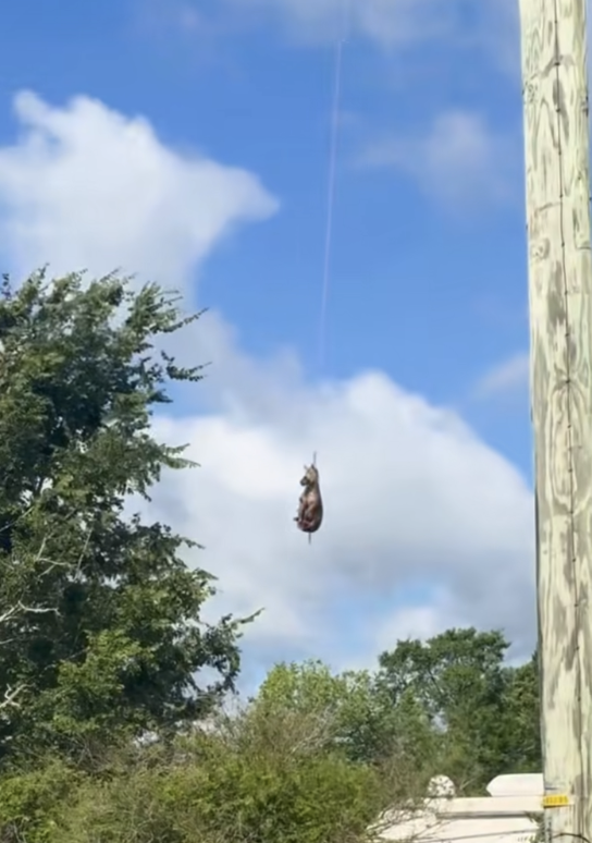 Un zèbre tracté par un hélicoptère dans le ciel. Cette image a été prise ce dimanche 8 juin 2025 dans le comté de Rutherford dans le Tennessee aux États-Unis.