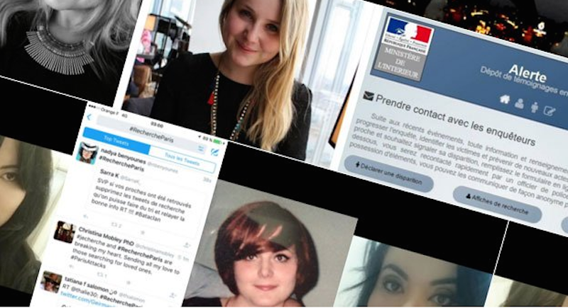 Twitter de son côté a contribué à la simultanéité des informations, notamment grâce au" #porte ouverte" dans un premier temps. Tweeté près de 200 000 fois, le mot-clé permettait d’avoir des adresse pour se cacher, pour être hébergé à l’abri des coups de feu. Suivi de près par les mots "#recherche Paris , ce hashtag permettait de rechercher les personnes ayant été sur les lieux des attentats, dans le but d’avoir de leur nouvelles, de savoir s’ils étaient sains et saufs. Ces appels à l’aide ont connu un nombre de retweets incalculable compte-tenu du nombre de personnes présentes dans les rues de Paris au moment des attaques. Le compte Twitter du Gouvernement appelle à tweeter #rechercheparis ou à téléphoner au 01 40 27 40 27 pour celles et ceux qui n’ont toujours pas de nouvelles de leurs proches. Malheureusement depuis le carnage, des avis de recherches se transforment en avis de décès puisque 48 heures après ces attentats, les recherches s’affinent et l’identité des personnes décédées est découverte.