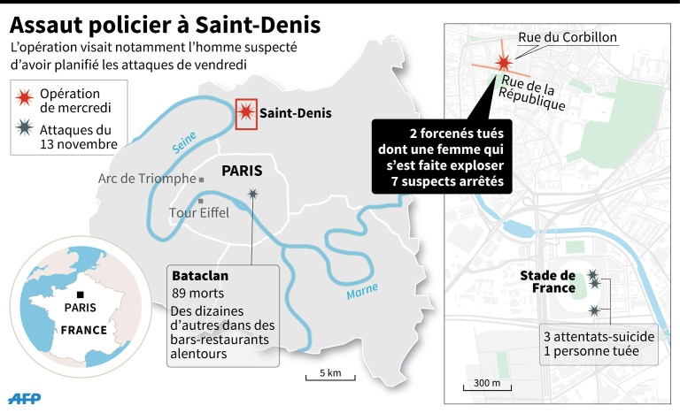 - Mercredi vers 04h20, la police donne l'assaut, dans le centre piétonnier de Saint-Denis, au nord de Paris, à un appartement. Il est occupé par un groupe qui, selon le procureur de Paris François Mollins, pouvait passer à l'acte compte tenu de son organisation et de son armement.