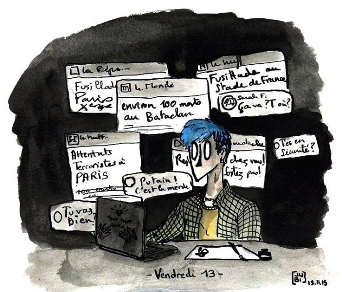 Les attentats du vendredi 13 novembre, ont touché la France au coeur. Tuant 130 personnes, en blessant physiquement 350, mais psychologiquement une nation toute entière. Le lendemain, le pays s'est réveillé nauséeux, choqués par les images irréelles qui tournaient en boucle sur les chaînes d'informations. Sur les réseaux sociaux, ce sont des soutiens de la France entière, du monde entier qui nous sont parvenus. Dessins, photos, messages... Créer, s'exprimer, comme une façon de s'accrocher à la vie, ne pas laisser le dernier mot aux barbares qui ont ensanglanté Paris.