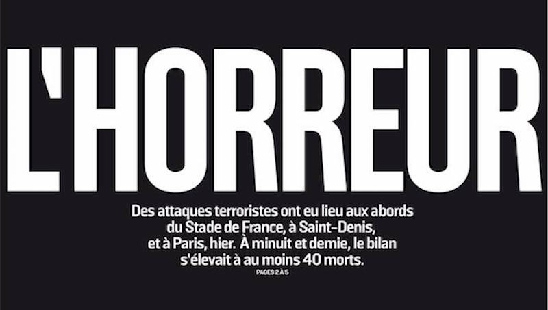Et puis L’équipe une nouvelle fois contraint à s’adapter à l’actualité d’une violence rare, à l’instar de la une que le quotidien sportif avait consacré aux attentats de Charlie Hebdo en janvier dernier. Son titre court et incisif, "L’Horreur", plonge dans ce sentiment d’impuissance ressenti par citoyens métropolitains et ultra-marins face à ces attaques sans précédent. C’est aux abords du Stade de France que les premières explosions se sont faites entendre, en plein match amical affrontant la France à l’Allemagne. Les deux puissances européennes unies sur un même stade lorsque des attentats ébranlent Paris dans le même temps font penser à une mise en scène dramatique, un jeu de circonstances touchant la France en plein coeur.
