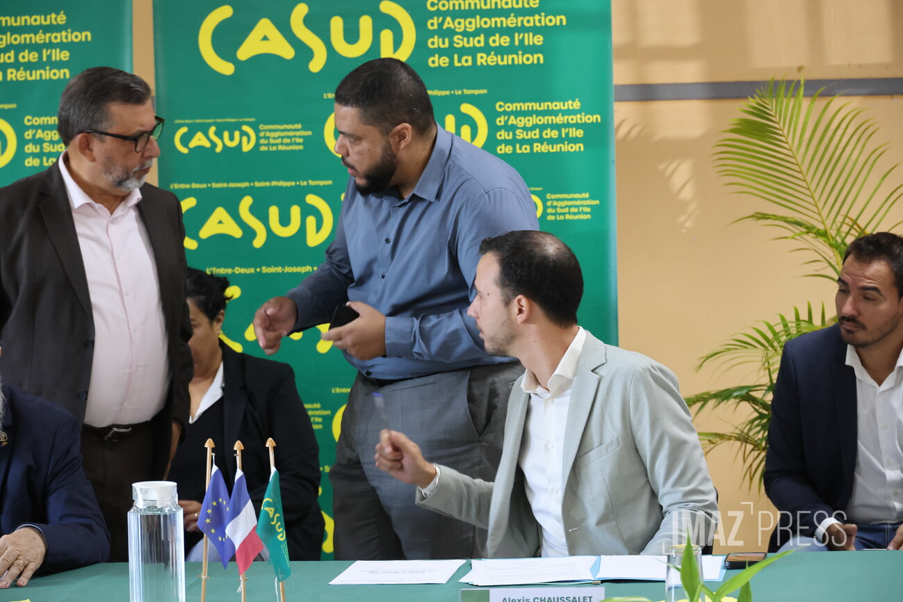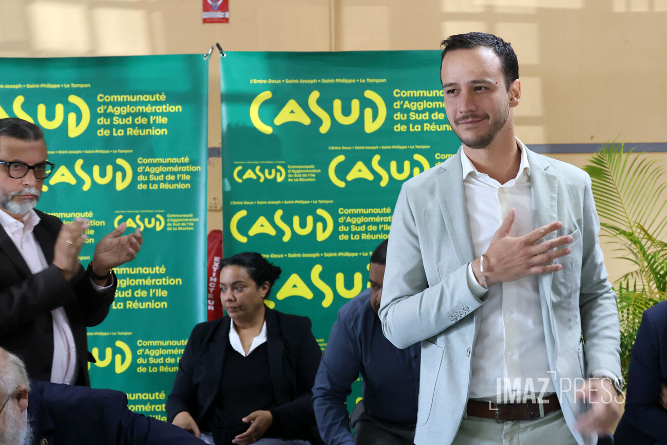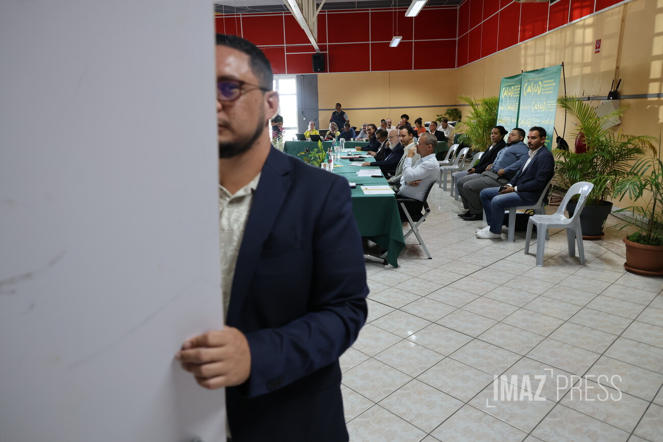 Ce vendredi 10 avril 2026, se tient le premier conseil communautaire de la Casud au 12ème km, issu des élections des 19 et 22 mars 2026. Alexis Chaussalet, maire du Tampon, a été élu président par 43 voix sur 48 donc 5 votes blancs ou nuls. Il confirme la présidence alternée avec son premier vice-président, Patrick Lebreton, qui à mi-mandat, prendra la présidence. La Casud comprend les communes du : Tampon, Saint-Joseph, Saint-Philippe et L’Entre-Deux. Nous sommes en direct (Photos : Richard Bouhet/www.imazpress.com)
