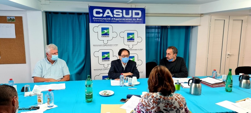 Réunion au siège de la Casud , ce mardi 3 juillet 2021 du Conseil Syndical des Hirondelles, présidé par André Thien Ah Khoon. Le Syndicat intercommunal d'alimentation en eau potable des Hirondelles, créé en mars 1984, a pour compétence la production d'eau potable à partir de la source des Hirondelles, située sur la commune du Tampon, et la gestion du réseau d'adduction y afférent, pour le compte de ses actionnaires (CASUD et CIVIS) et plus particulièrement pour les communes du Tampon, de Saint-Pierre, de la Petite-Ile et de Saint-Joseph afin de garantir aux populations des villes concernées de l'eau potable. Nous publions le communiqué ci-dessous (Photo casud)