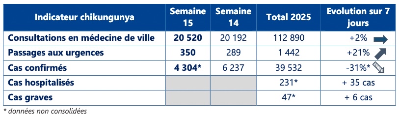 Depuis le début de l’année 2025, ce sont plus de 39 000 cas confirmés de chikungunya autochtones qui ont été signalés à la Réunion. Pour la semaine 15, on observe une diminution du nombre de cas par rapport à la semaine précédente avec 4 304 cas confirmés signalés (contre 6 237 en S14).