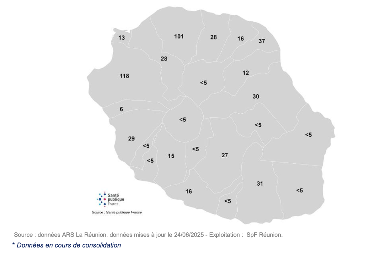 Santé Publique France (SPF) a publié son dernier bulletin de surveillance épidémiologique du chikungunya ce mercredi 25 juin 2025. Depuis le début de l’année 2025, près de 54.250 cas confirmés biologiquement ont été signalés à La Réunion. Si la transmission virale est toujours en diminution, on observe une circulation limitée à certaines communes et sans impact significatif sur le recours aux soins. Ces deux dernières semaines, le nombre de cas confirmés par communes étaient supérieur à 100 à Saint-Paul et Saint-Denis. Les cas confirmés étant en diminution, SPF ne communiquera plus de point épidémiologique dédié, à partir de la semaine prochaine. Nous publions le bilan ci-dessous (Photo d'illustration rb/www.imazpress.com)