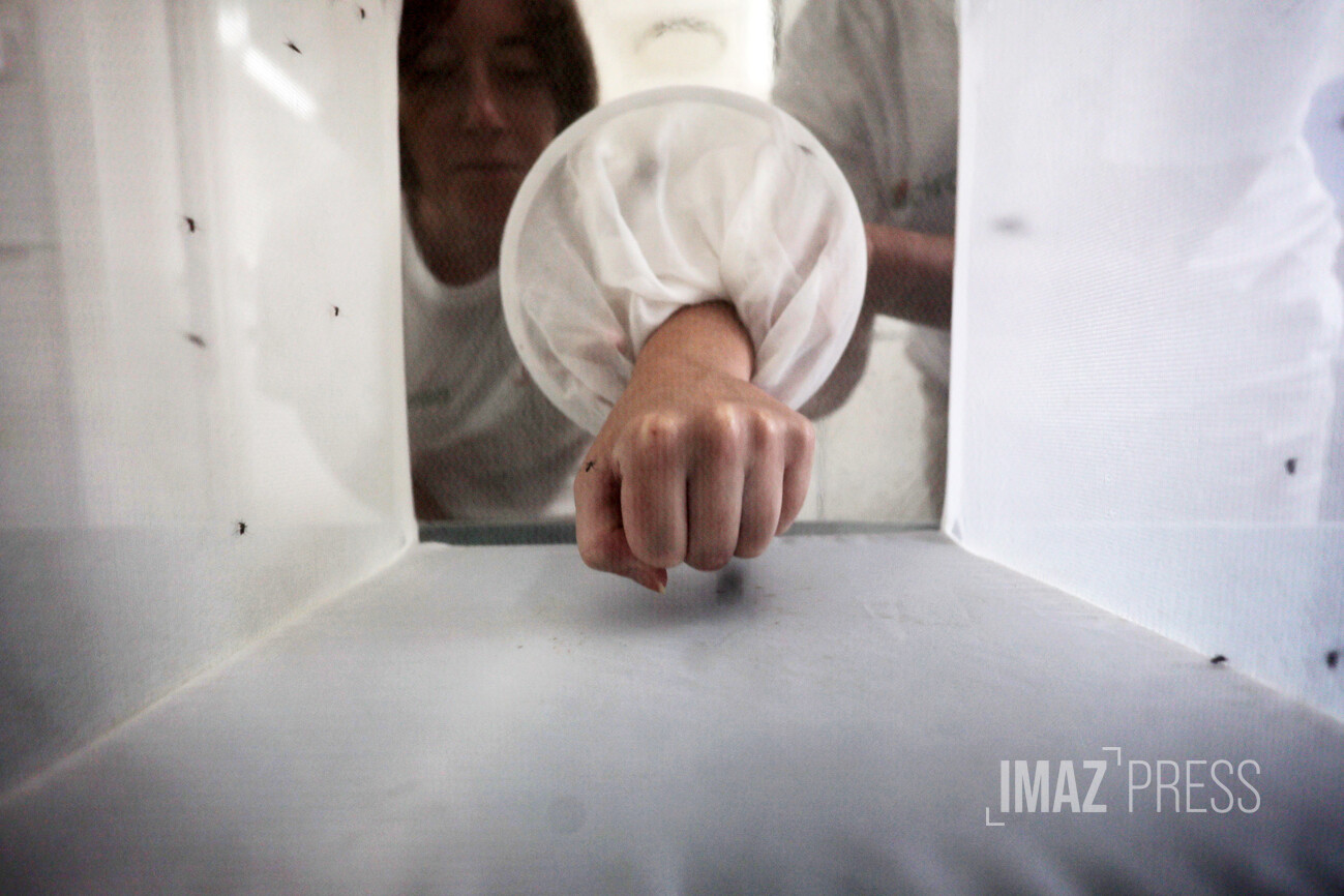 Sur une table, quatre cages avec une cinquantaine de femelles moustiques tigres à l'intérieur, prête à piquer pour se nourrir de sang humain. Regardez.