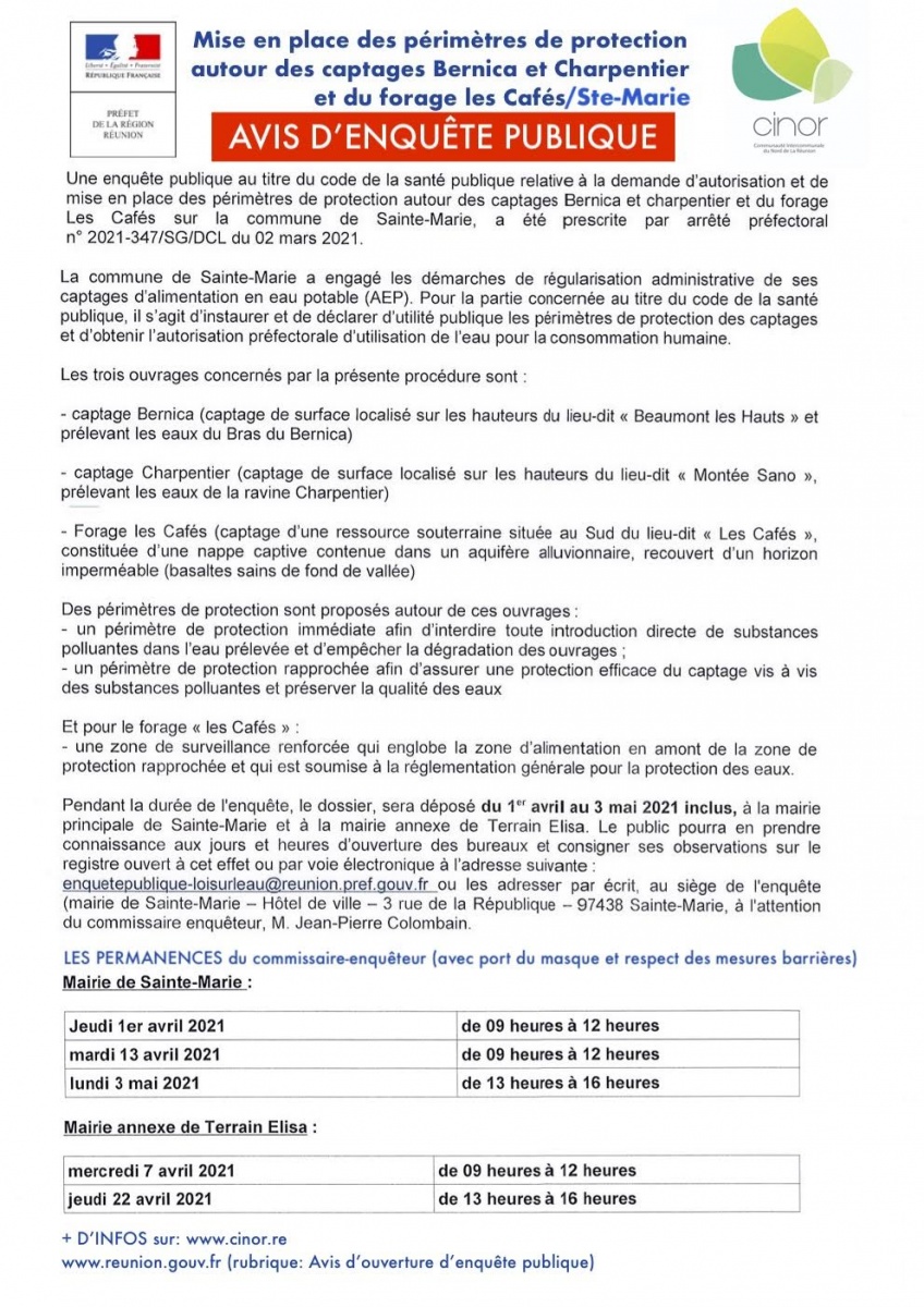 La Cinor lance une enquête publique pour la mise en place des périmètres de protection des captages Bernica et Charpentier ainsi que du forage des Cafés à Sainte-Marie. Nous publions cet avis ci-dessous (Photo Cinor)