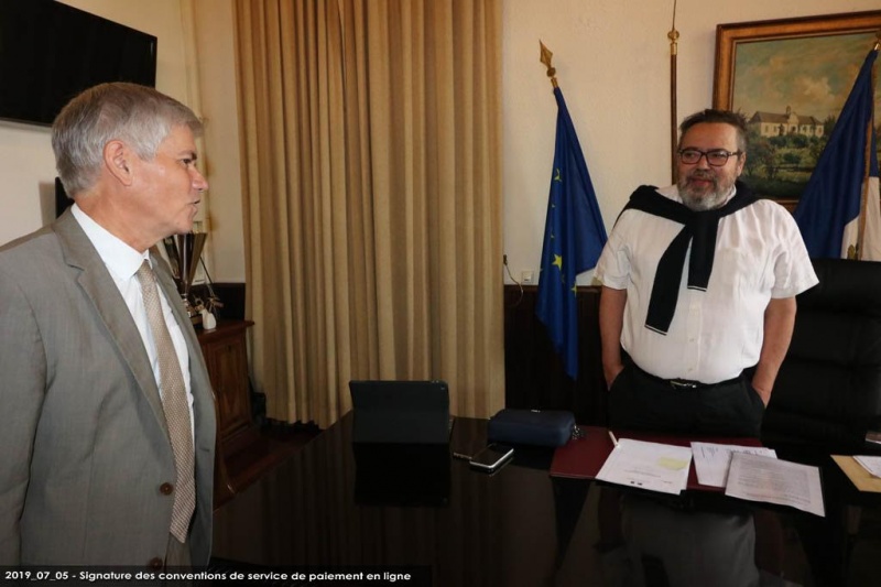 Le président de la Civis, Michel Fontaine, le directeur régional des finances publiques, Gilles Deshayes et la comptable Public, Maryvonne Vidal ont signé ce vendredi 5 juillet 2019 à la mairie de Saint-Pierre des conventions de service de paiement en ligne. "Le paiement par Internet dans les collectivités locales est à la fois un enjeu de modernisation et une ouverture vers la dématérialisation" commente la Civis dans le communiqué que nous publions ci-dessous (Photo D.R./Civis)