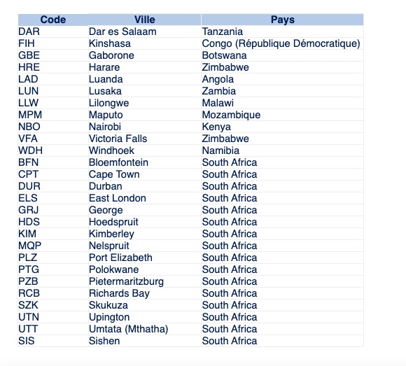 Les passagers d’Air Austral pourront ainsi se rendre à Port Elizabeth en Afrique du Sud à partir de 581€ TTC*, à Harare au Zimbabwe à partir de 757€ TTC*, aux chutes victoria au Zimbabwe à partir de 813€TTC*, à Windhoek en Namibie à partir de 811€ TTC*, ou encore à Maputo au Mozambique à partir de 818€ TTC*.