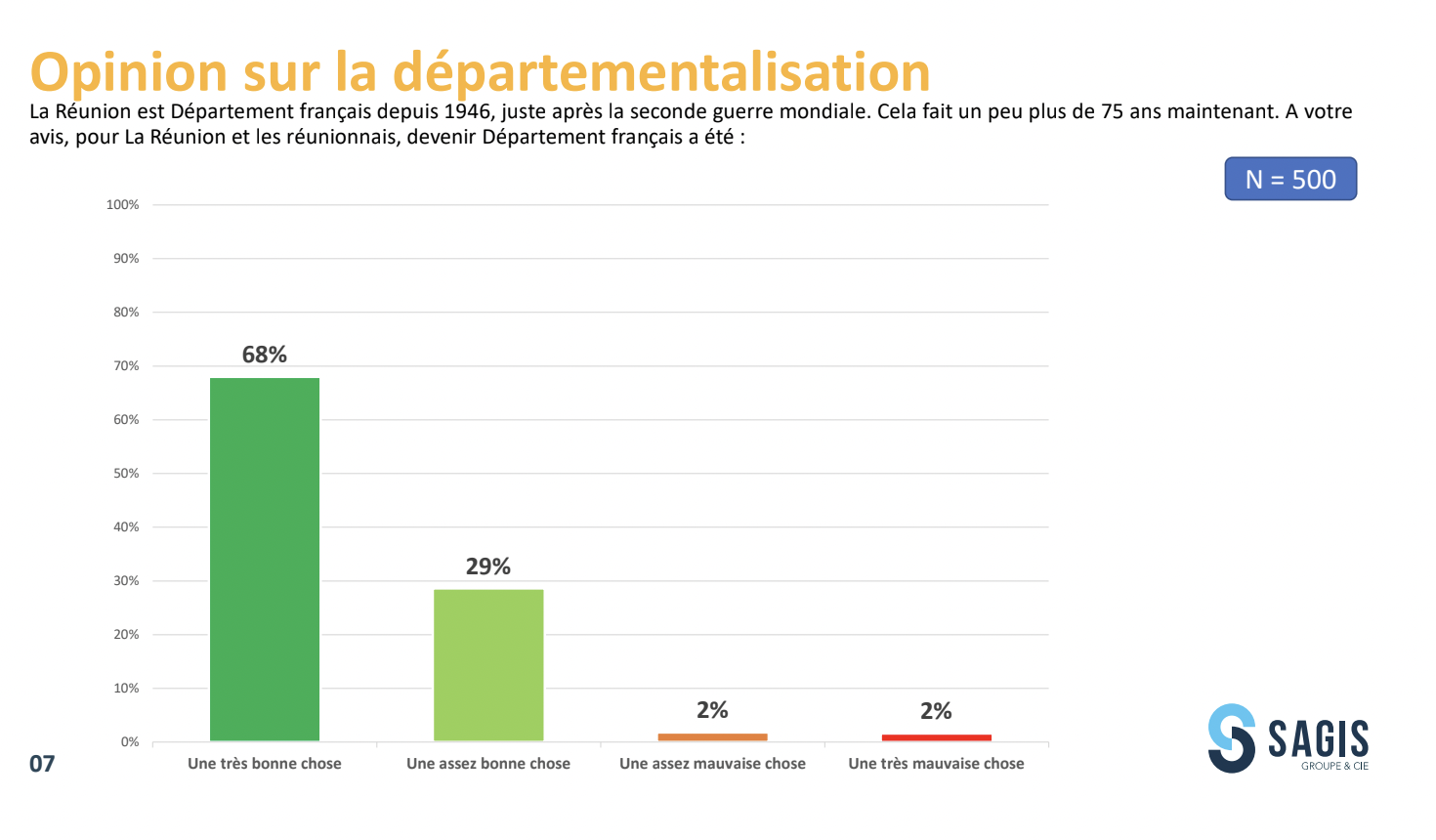 • 68% des personnes interrogées estiment que la Départementalisation a été "une très bonne chose" pour La Réunion et les réunionnais, 29% une " assez bonne chose "; 3% sont d’un avis inverse.