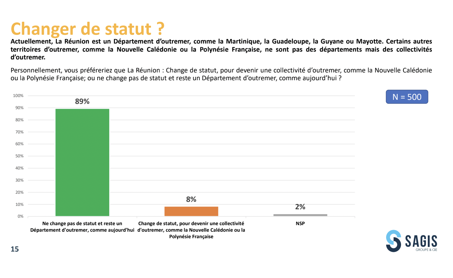 • 89% préfèrent que la Réunion garde son statut actuel alors que 8% préféreraient un changement de statut qui irait vers celui d’une collectivité d’outre mer, à l’image de la Nouvelle Calédonie ou de la Polynésie Française.