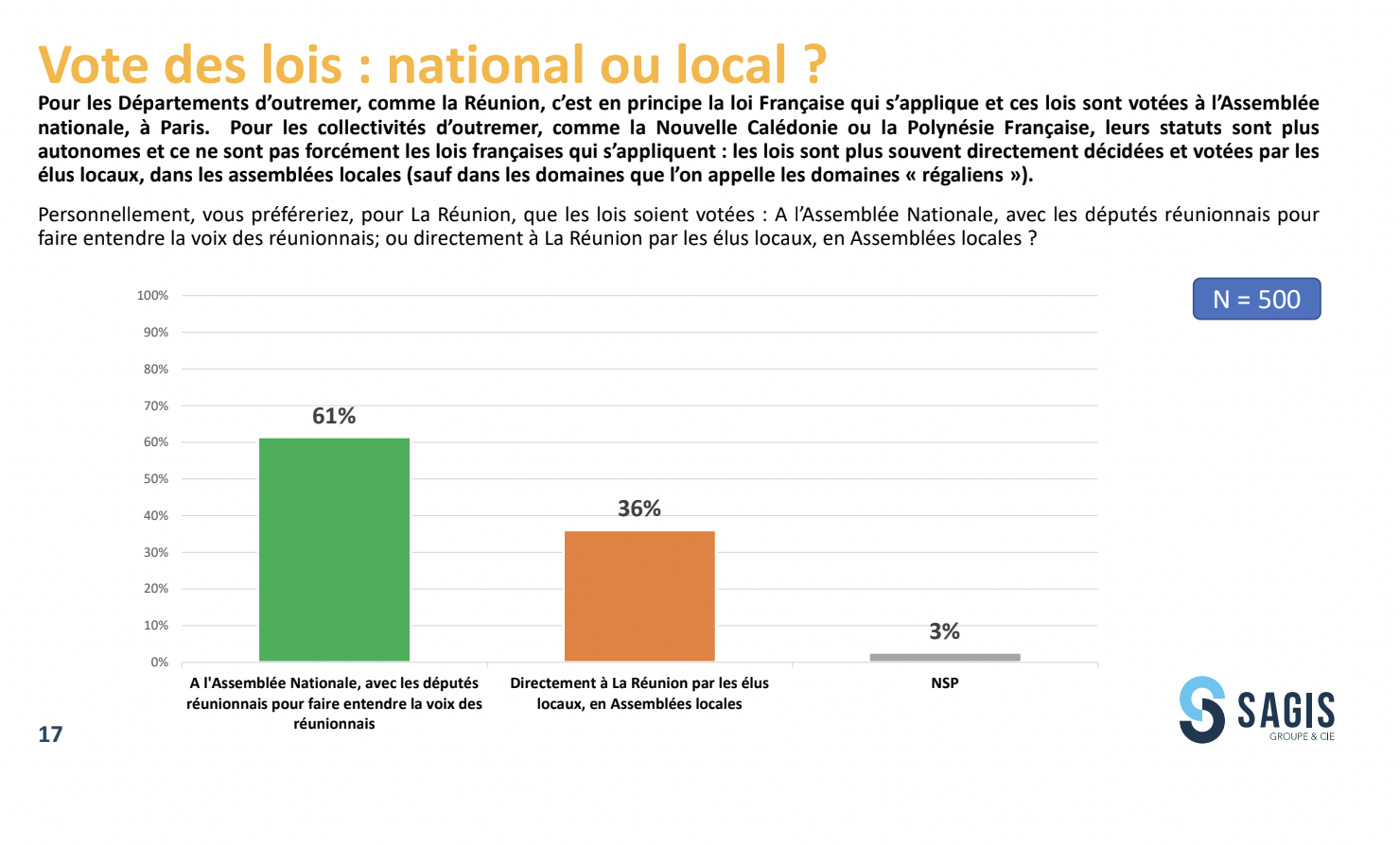 • Pour autant, questionnés sur leur préférence pour le vote des lois, 61% préfèrent qu’elles soient votées à Paris, à l’Assemblée Nationale (69% des 50 ans et plus, 72% dans le Nord), alors que 36% préféreraient que les lois soient votées à La Réunion, par les élus locaux en Assemblée locale (46% des 18-34 ans, 41% des 35-49 ans, 49% dans l’Est).