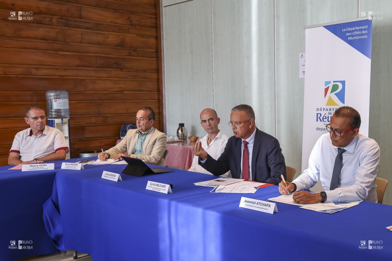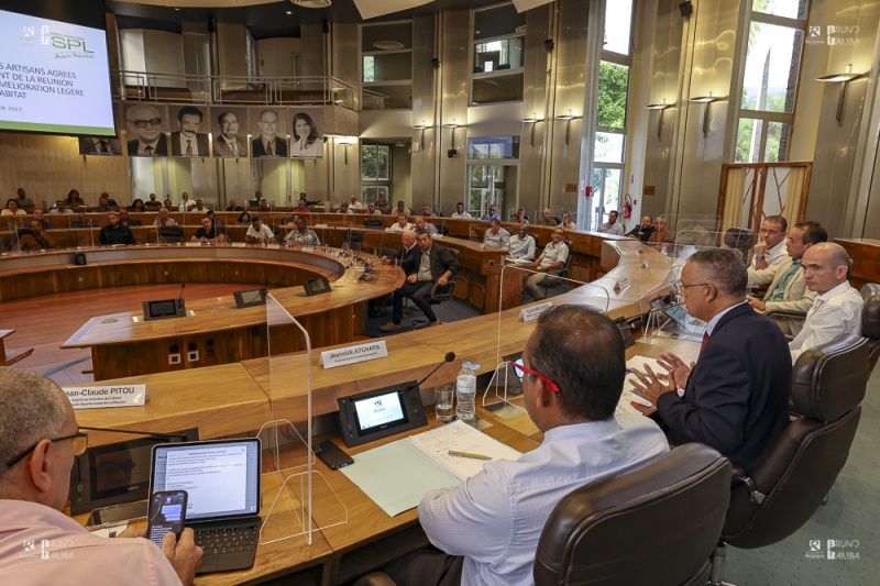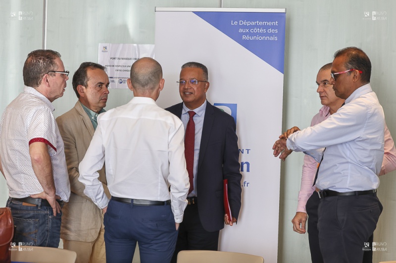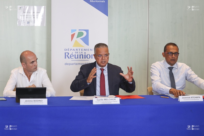 Mercredi 15 juin 2022, Cyrille Melchior, président du Département a annoncé de nouvelles mesures de soutien pour l'amélioration de l'habitat en présence de Jérôme Bodino, directeur général de la Société publique locale Avenir Réunion (SPLAR) et de Jeannick Atchapa, vice-président de la collectivité départementale. Au programme : une augmentation du budget ainsi qu'une amélioration du dispositif global de rénovation, au bénéfice des particuliers comme des artisans du secteur du BTP. (Photos : Bruno Bamba / Département)
