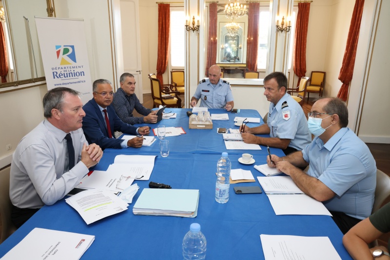 Ce mardi 17 mai 2022, Cyrille Melchior, président du Conseil départemental a présidé aux côtés de Jacques Billant, préfet de La Réunion le comité de pilotage stratégique du SDIS en présence de Stéphane Fouassin, président délégué du Conseil d'administration du SDIS, et le colonel Frédéric Léguillier, directeur du SDIS. Nous publions ici le communiqué du Département (Photos : Département)