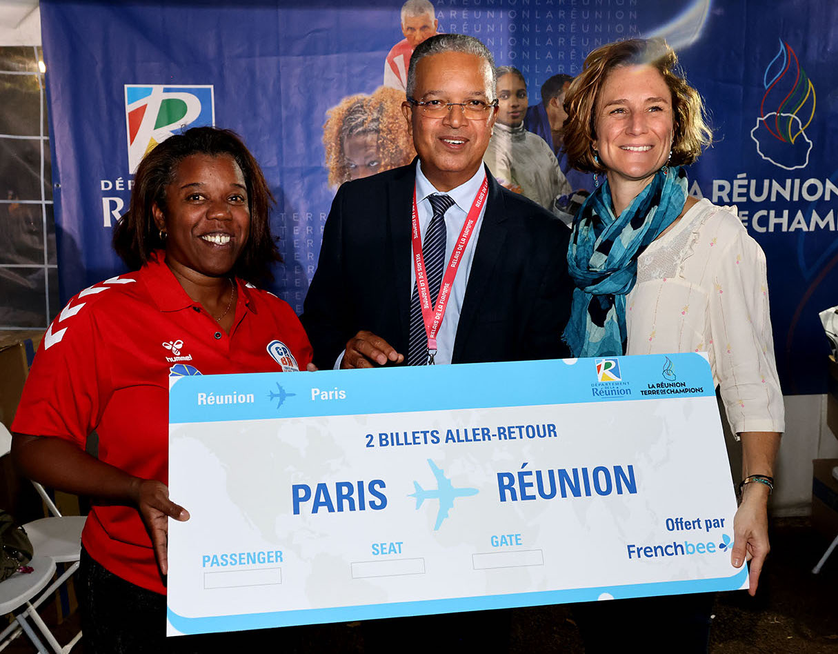 Le nom de Linda Berby a été tiré au sort le 11 juin, à la veille du jour d’arrivée de la Flamme à La Réunion. Et le 12 juin, c’est sur le stand du Département au Jardin de l’Etat à proximité du chaudron olympique qu’elle était invitée à recevoir sa récompense des mains du Président Cyrille Melchior et de Karine Bonnal, représentante de la compagnie French Bee.