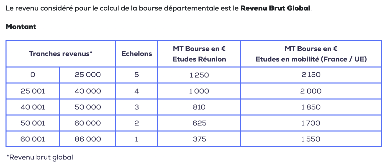 Le montant de la bourse est calculé en fonction du revenu des parents. Pour bénéficier de la bourse départementale les ressources sur l’avis d’impositions des responsables légaux ou du responsable légal ne doivent pas être supérieurs à 86.000 euros sur l’année. Nous publions ci-dessous le tableau du Département sur l’attribution de la bourse pour les étudiant.e.s à La Réunion et en mobilité dans l’Hexagone ou dans l’UE.