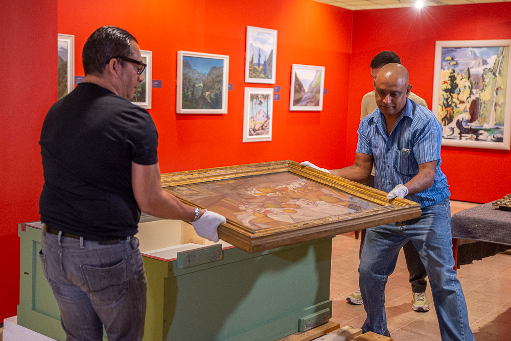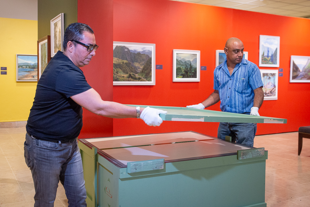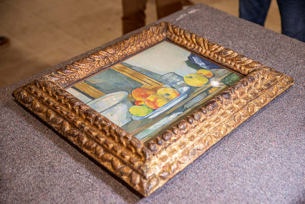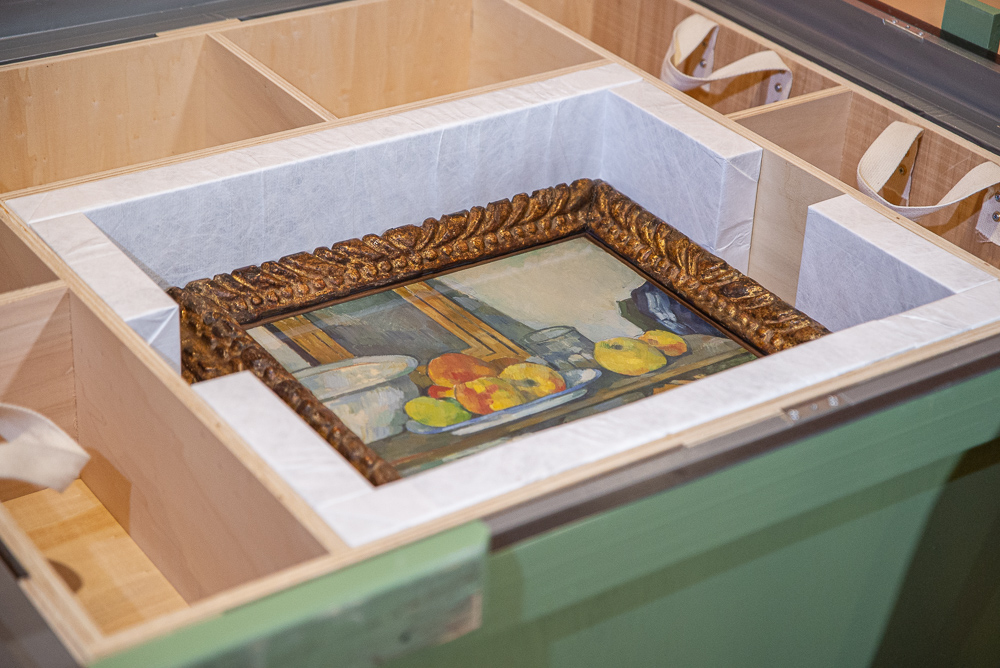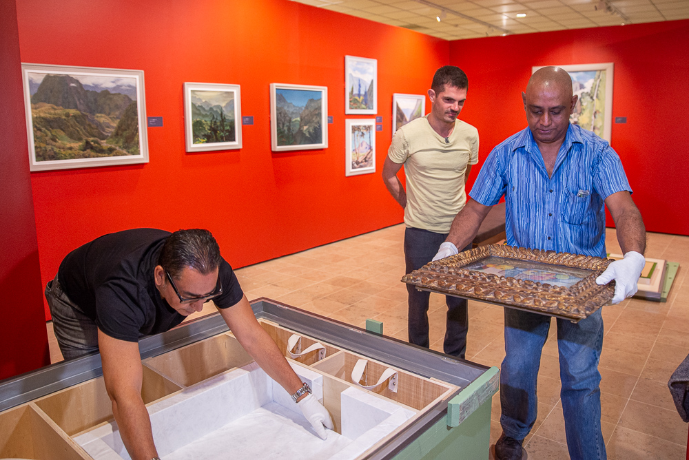 Quelques heures avant le vernissage de l’exposition, c’est avec la plus grande précaution que les 2 toiles de Paul Cézanne ont été sorties de la caisse ayant servi à leur transport aérien. Jacky Courtois, directeur par intérim du Musée Léon-Dierx a indiqué que : « Les œuvres ont voyagé en soute avec des médicaments à très basse température. Aussi un délai d’acclimatation de 48 heures – au lieu des 24 heures prévues – a été observé avant l’ouverture de la caisse ».