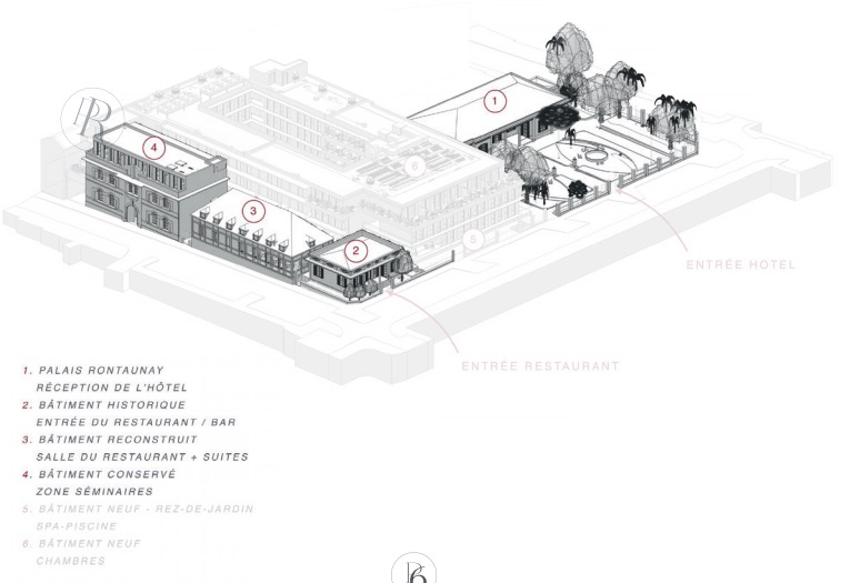 Le Palais Rontaunay inscrit aux Monuments Historiques sera totalement restauré (intérieur, extérieur, couverture, jardin). Le parti architectural repose sur l'idée d'une architecture qualitative à la fois respectueuse de l'architecture locale et patrimoniale de la ville, en utilisant des lignes sobres et contemporaines. Le végétal participe à l'architecture du bâtiment. Deux cocons végétaux offriront de la fraîcheur de chaque côté de l'allée centrale. L'espace sera