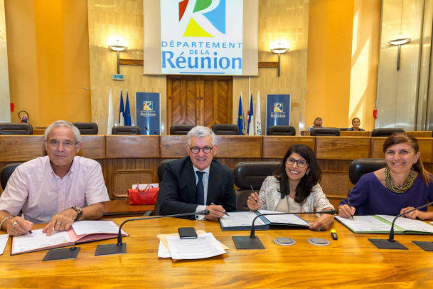 Nassimah Dindar, Présidente de l'Assemblée Départementale, Jean-Claude Lacouture, membre de l'Association des Maires de La Réunion, Bruno Janet, conseiller du Président de la société Orange et Mireille Helou, directrice Orange Réunion Mayotte ont cosigné ce mercredi 30 mars une charte "Qualité Réseau" ayant pour principaux objectifs de renforcer le dialogue avec les collectivités locales et d'améliorer l'efficacité des interventions sur le réseau.