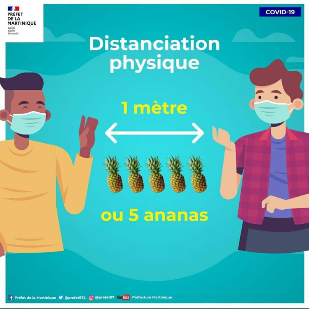 L'illustration se voulait drôle mais elle a provoqué un sacré tollé... Sur sa page Facebook, la préfecture de Martinique avait posté un dessin censé définir la règle de distanciation physique. On y voit deux hommes masqués, qui se tiennent à un mètre de distance. Pour souligner cette distance, la préfecture de Martinique a cru bon de préciser : "un mètre... ou 5 ananas". Le trait d'humour n'a pas fait l'unanimité, loin de là.