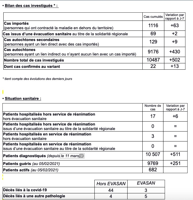 Au total, 10 507 cas ont été diagnostiqués sur le territoire depuis l’apparition du premier cas le 11 mars 2020, dont 66 évacuations sanitaires au titre de la solidarité régionale. Au 05 février 2021, hors décès, compte tenu des 9 769 guérisons, 682 cas sont encore actifs à ce jour. 10 487 cas ont été investigués à cette heure par l’ARS, Santé publique France et l’Assurance Maladie, dont 10% sont des cas importés.