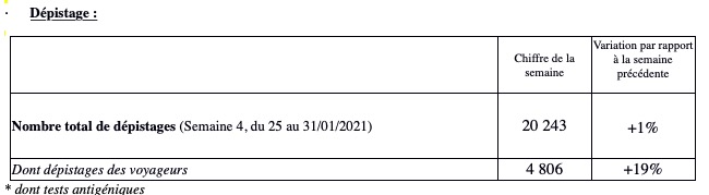 Sur la semaine 4, le taux de positivité était de 2,4 % (source SIDEP, ARS). Il est en augmentation par rapport à la semaine précédente (1,9%) et reste inférieur au seuil de vigilance (5%). Le taux de positivité chez les voyageurs a augmenté et est de 1%.