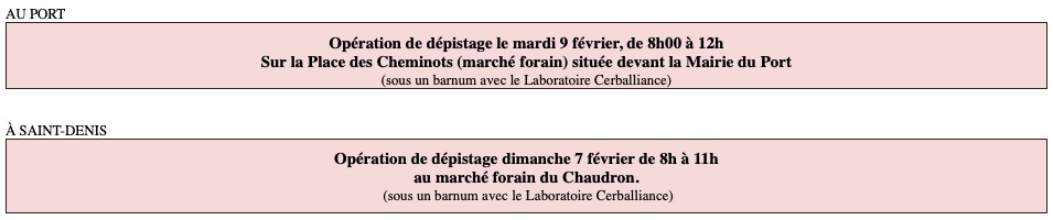 Afin de faciliter l’accès aux tests et freiner la circulation de la covid-19 dans l’île, l’ARS La Réunion et les communes du Port et de Saint-Denis, avec le soutien des laboratoires et des pharmacies, organisent des opérations de dépistage pour la population.