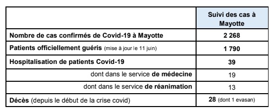 L'ARS de Mayotte annonce 28 nouveaux cas de Covid-19, ce qui fait monter le bilan total sur l'île à 2.268 cas confirmés depuis le début de l'épidémie. L'ARS informe également que 1.790 personnes sont guéries. Le bilan de patients décédés se porte toujours à 27 morts. Par ailleurs, 39 patients sont hospitalisés dont 13 en service de réanimation. A noter enfin le décès d'un patient mahorais qui a succombé au virus alors qu'il venait d'arriver au CHU Félix Guyon, le 20 mai dernier. Nous publions le communiqué ci-dessous. (Photo d'illustration rb/www.ipreunion.com)