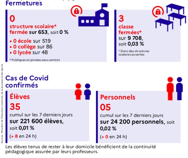 Ce vendredi 5 février 2021, le rectorat annonce que 35 élèves et 5 personnels ont été testés positifs à la Covid-19 ces sept dernières jours. Trois classes ont par ailleurs été fermées, et tous les établissements scolaires de l'île sont ouverts. "Grâce au travail de repérage et de suvi des cas contacts pour éviter les chaînes de contamination réalisé par la cellule de signalement du rectorat, en lien avec l'ARS, l'impact du Covid en milieu scolaire reste maîtrisé" affirme le rectorat (Photo d'illustration rb/www.ipreunion.com)