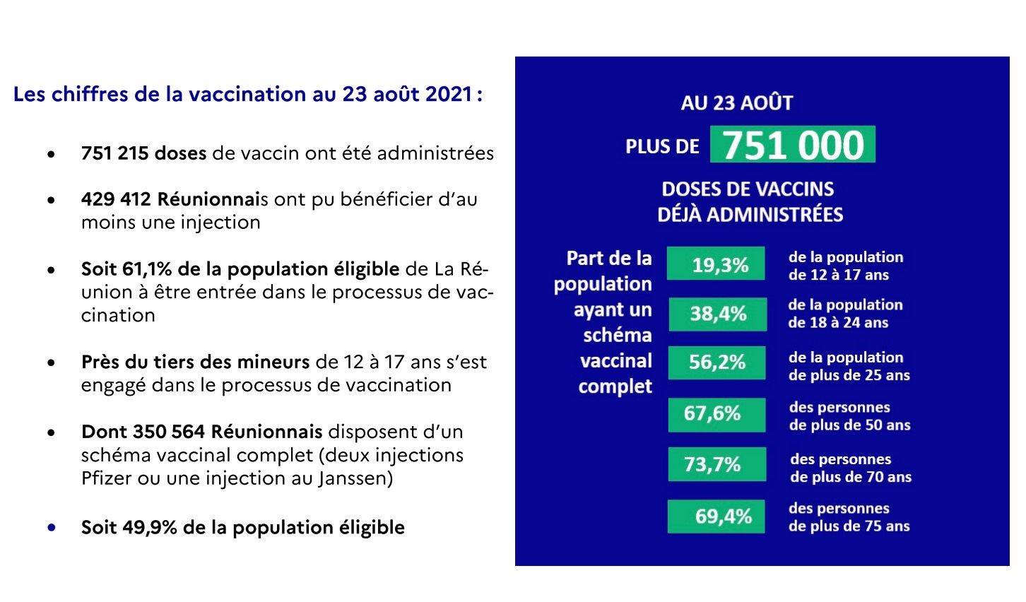 Depuis le début de la campagne de vaccination, 429.412 Réunionnais ont reçu au moins une injection, et 350.564 Réunionnais disposent d'un schéma vaccinal complet (soit 49,9% de la population éligible). Malgré une amélioration de certains indicateurs (taux de positivité et nombre de nouveaux cas en baisse), le niveau de circulation du virus reste élevé sur l'île et le nombre de décès est en forte augmentation. L'ARS rappelle à l'ensemble des Réunionnais et particulièrement aux personnes fragiles, la nécessité de se faire vacciner sans attendre. Nous publions ici le communiqué de l'ARS (Photo rb/www.ipreunion.com)