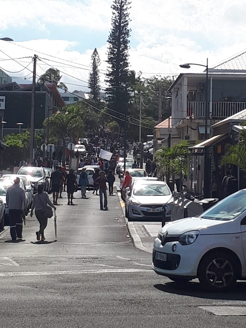 A Saint-Pierre, le cortège déambule en direction du centre-ville. Les participants sont environ 400. L'ambiance est relativement bon enfant, sans tension.