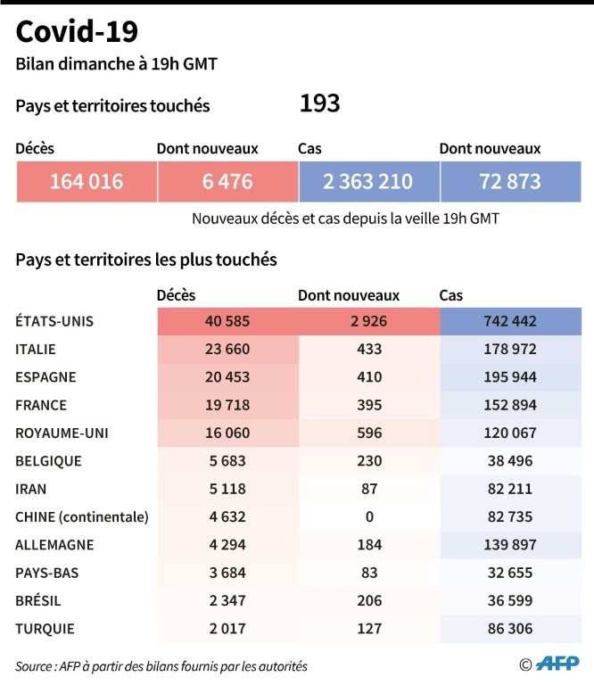 • Dans le monde, le nombre de patients contaminés a passé le cap des 2 millions. Plus de 164.000 personnes ont perdu la vie. Les Etats-Unis sont de loin le pays le plus touché et a passé la barre des 30.000 décès.