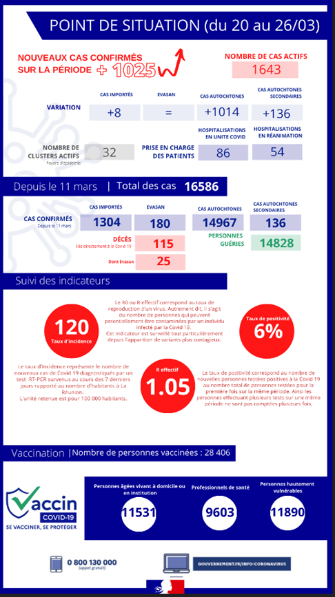 Les indicateurs montrent une aggravation de la situation avec une poursuite active de l’épidémie de Covid-19 à La Réunion. En toute circonstance, au travail, en famille ou entre amis, il est essentiel que chacun continue à être vigilant : maintenir les gestes barrières, limiter ses interactions sociales et respecter la mesure du couvre-feu. Il est également essentiel pour les personnes prioritaires de se porter volontaire pour la vaccination.